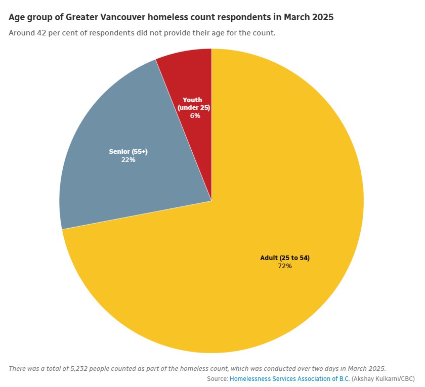 2025 年大温地区无家可归者统计显示,在提供年龄信息的受访者中,22% 的人年龄超过 55 岁。