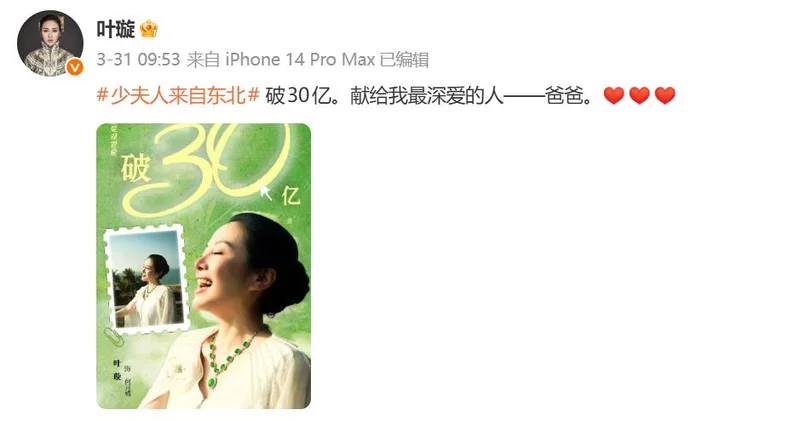 近日,葉璇也闖入短劇賽道,參演的《少夫人來自東北》拿下觀看量破30億、熱度值破億的好成績。葉璇發文:獻給我最深愛的人——爸爸。