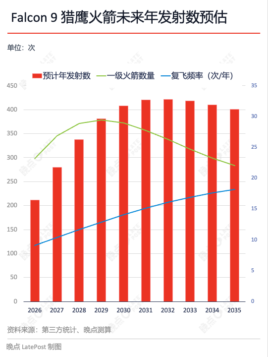 目前,SpaceX 已經把一級火箭的制造流水線跑通,每年能穩定新造 7 到 9 枚。如果單枚火箭的復飛壽命全部逼近 40 次極限,且翻修時間持續縮短,獵鷹 9 號的發射頻次遠未到頂。按照規劃,它的發射頻次將在 2030 年前後沖擊每年 400 次的峰值,隨後回落並穩定在每年 360-370 次左右。