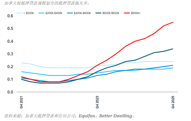 据本国房产分析机构Betterdwelling报道:加拿大银行家协会(CBA)最新数据显示,2025 年第四季度,贷款额在85万元及以上的房贷违约率已高达 0.55%,相比小额房贷(低于 20 万加元)的 0.24%,翻了一倍多。