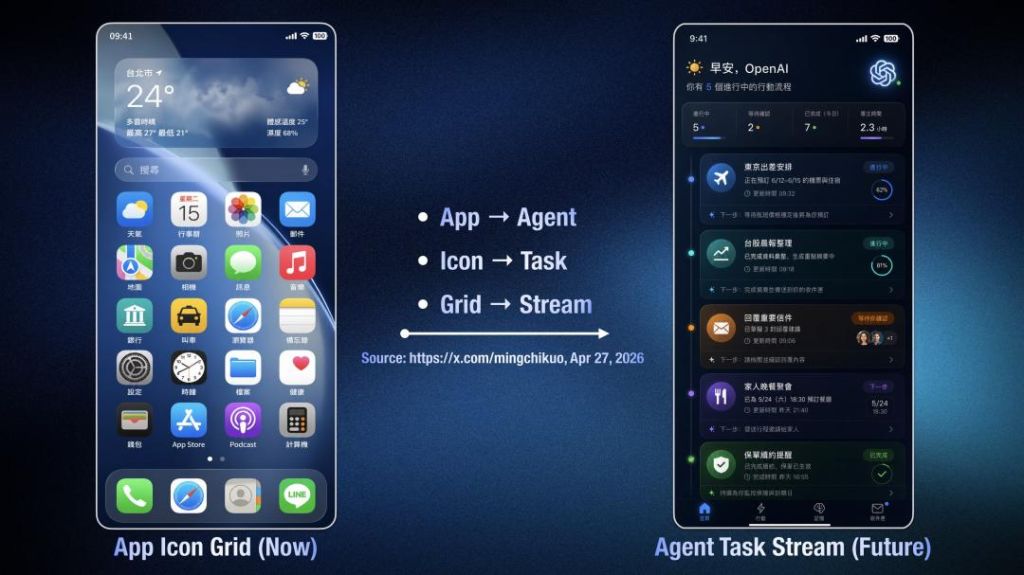 目前智慧手机主要依靠多元特性的App 给予各种协助,而在OpenAI 想像的 AI Agent 手机里,则是通过执行各种任务来满足需求。