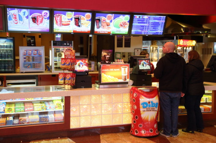 限制食品饮料进入影院的标牌,不但如此还要限制饮料的牌子,这家院线只能喝可口可乐!