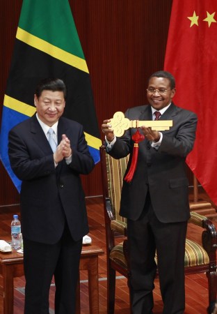 当地时间3月25日,习近平在中国援建坦桑尼亚的尼雷尔会议中心,将金钥匙递交给坦总统基奎特