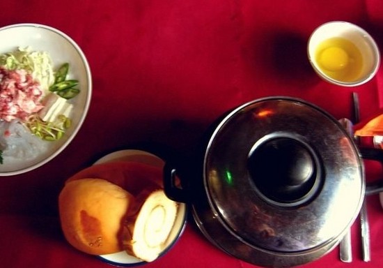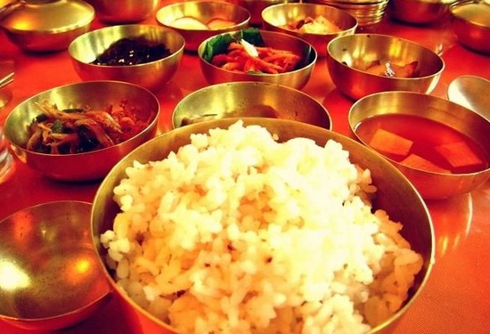 在开城的午餐,每个人面前九个碗,而且每人还有另外一碗汤。这金光闪闪的,会有富饶的错觉。