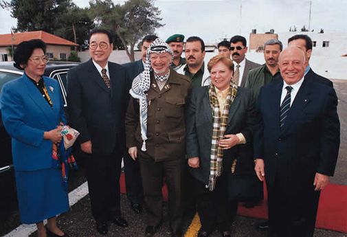 2002年10月25日,江泽民在得克萨斯州、美国总统布什的私人牧场与他进行会晤。江泽民和夫人王冶坪在门口受到布什和夫人劳拉的热烈欢迎。