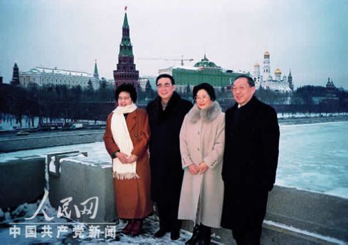 李岚清夫人章素贞。图为1998年2月18日,李鹏、朱琳访问俄罗斯期间与李岚清和夫人章素贞合影。