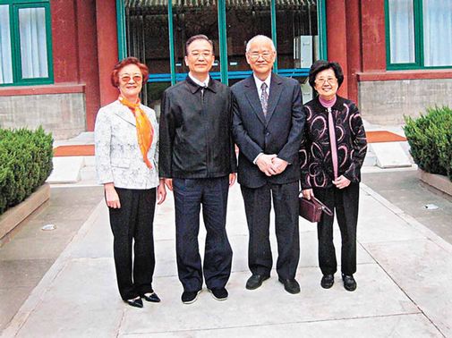 2011年4月23日,温家宝与夫人张培莉在北京接见前港区人大代表吴康民夫妇。