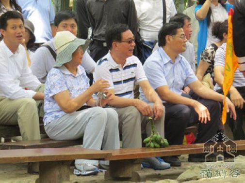 2013年2月17日,贺国强携家人参观海南省甘什岭槟榔谷原生态黎苗文化旅游区。图为贺国强与夫人一起观看黎族八音民乐。