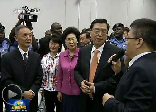 张德江的妻子辛树森曾任中国建设银行副行长,现已退休。与张德江育有一女。图为2013年9月,张德江访问尼日利亚,夫人辛树森陪同。(央视视频截图)
