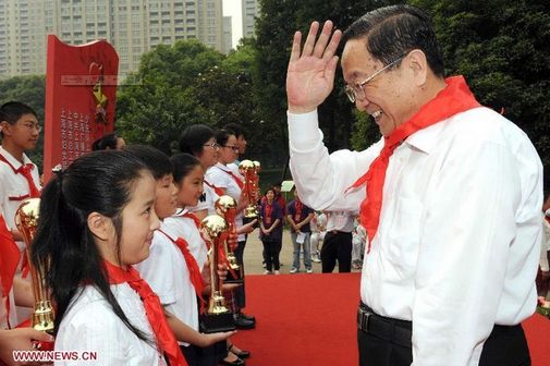 俞正声的妻子张志凯是中共开国上将张爱萍的女儿,曾任中国长城计算机集团公司的负责人。张志凯为人低调,极少露面。图为2011年5月31日,时任上海市委书记俞正声为上海市“十佳少先队员”获奖学生颁奖。
