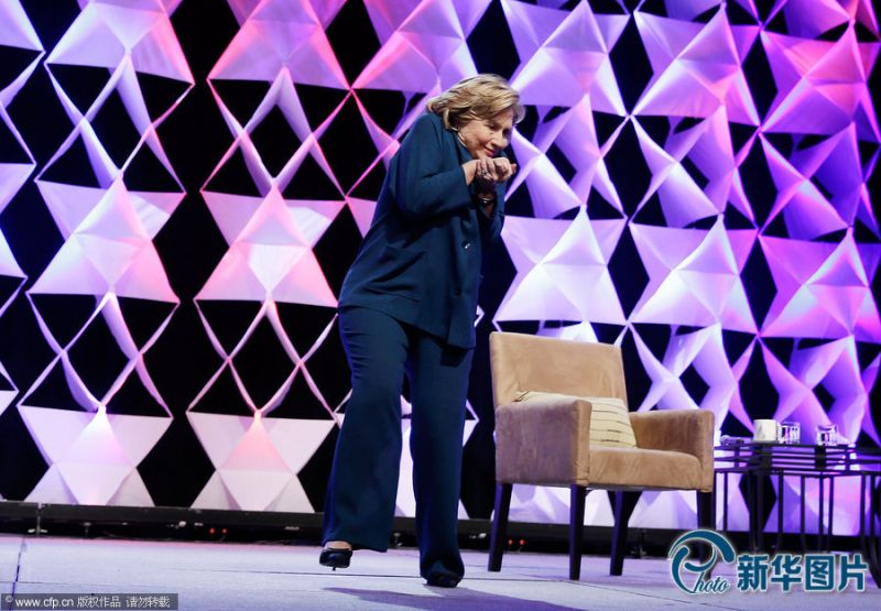 当地时间2014年4月10日,美国拉斯维加斯,美前国务卿希拉里·克林顿美国废弃物回收协会会议上发表演说时,一名女子对她丢鞋遭到警方逮捕。希拉里成功闪避,沉着应对,还拿这次事件开玩笑。