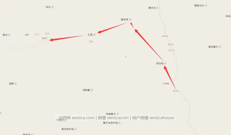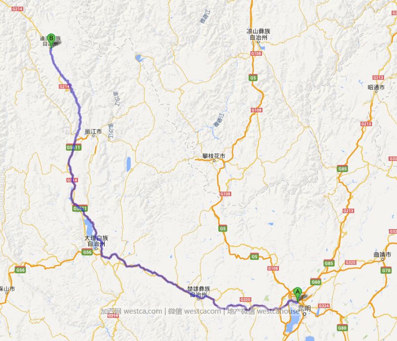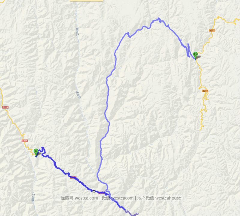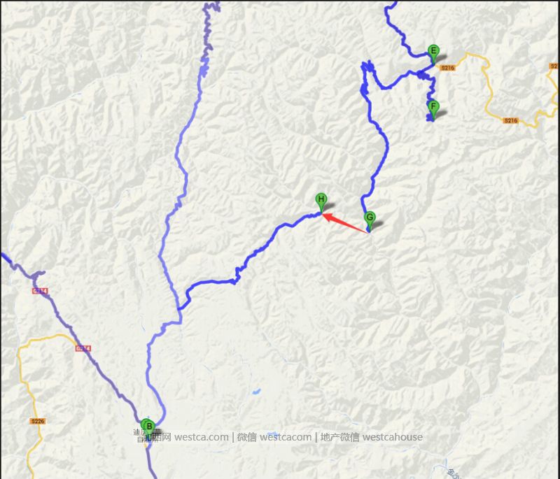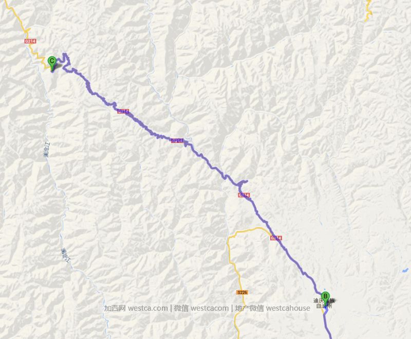 其中G点到H点在地图上没有路的,只能略标。基本路线是:香格里拉镇——鹅初——各卡乡(思子功)——浪都村——各咱乡——香格里拉。