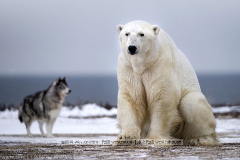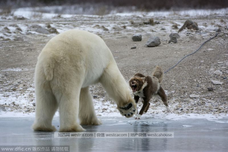 面对不怀好意,体积是自己好几倍的北极熊一步步靠近时,勇敢的狗狗丝毫没有退缩,站起身准备向入侵者发动攻击,成功逼退北极熊,并迫使其保持距离。