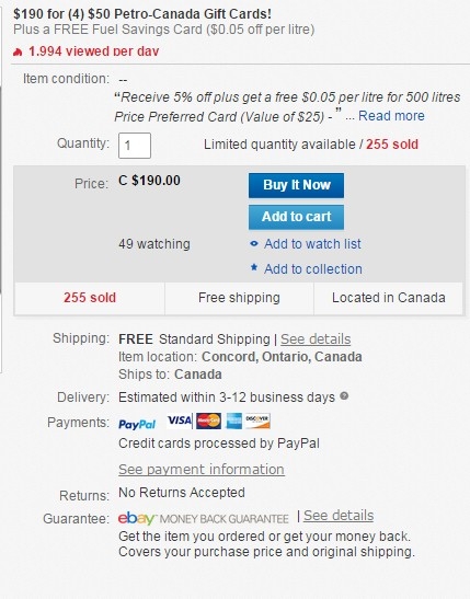 (加西网简讯)Ebay.ca现有4张$50Petro-Canada礼品卡特价$190
