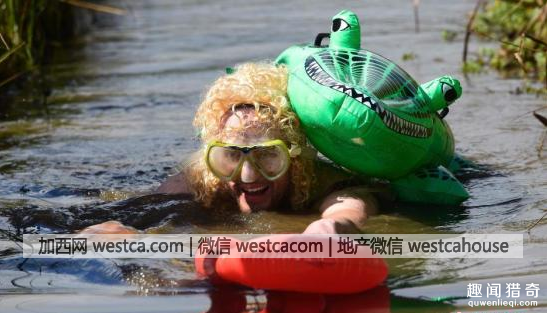 参赛者身穿五花八门的潜水装,完成沼泽地游程。有些选手的造型真有点“辣眼睛”。