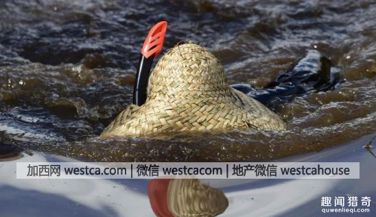 还有的参赛者带着草帽潜在泥水中,远远望去,只能看到一只草帽的水中移动。