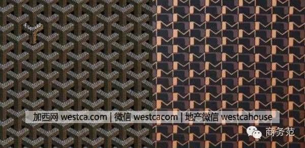 再说一个和Goyard花纹有点相似的Moynat,Moynat的花纹看着就更加密集恐惧症了。左边的Goyard是防水帆布材料。右边展示的Moynat,用的是全皮。