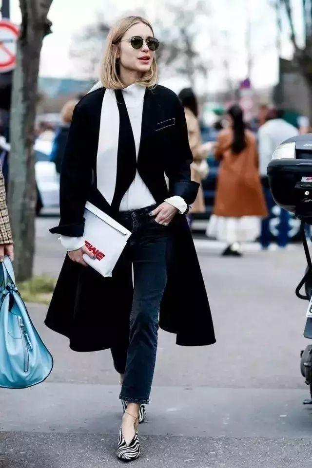 黑色大衣绝对的经典,虽然全黑look是冬季你们常用的造型,但也平淡到似路人毫无存在感,内搭白上衣搭配手拿包,让整体造型简约不失细节,时髦度不断up。