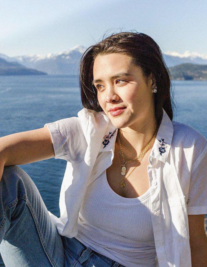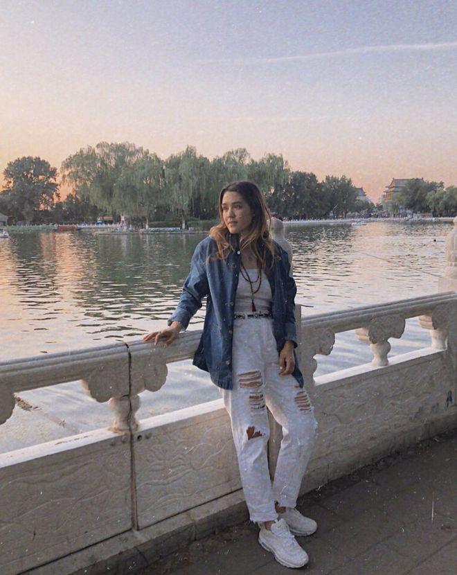 白背心,白衬衫再加上牛仔裤,略施粉黛,是属于她这个年纪的清新自然之美。