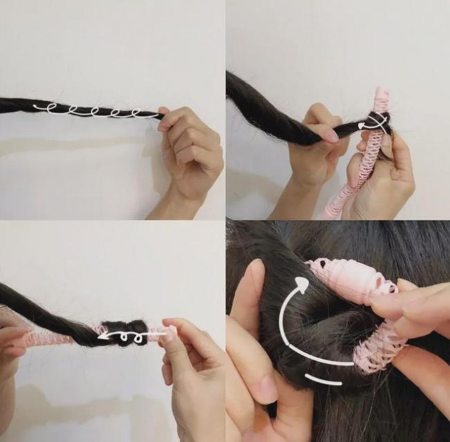 把头发分几绺缠在甜甜圈上,注意好手法,不然头发容易散,卷好后卡好甜甜圈的卡槽。