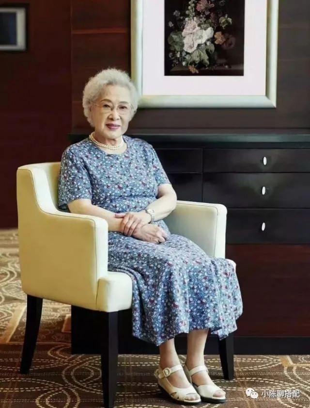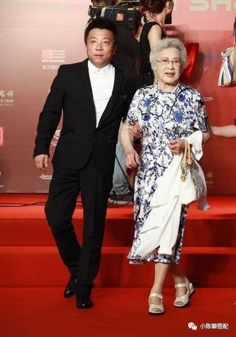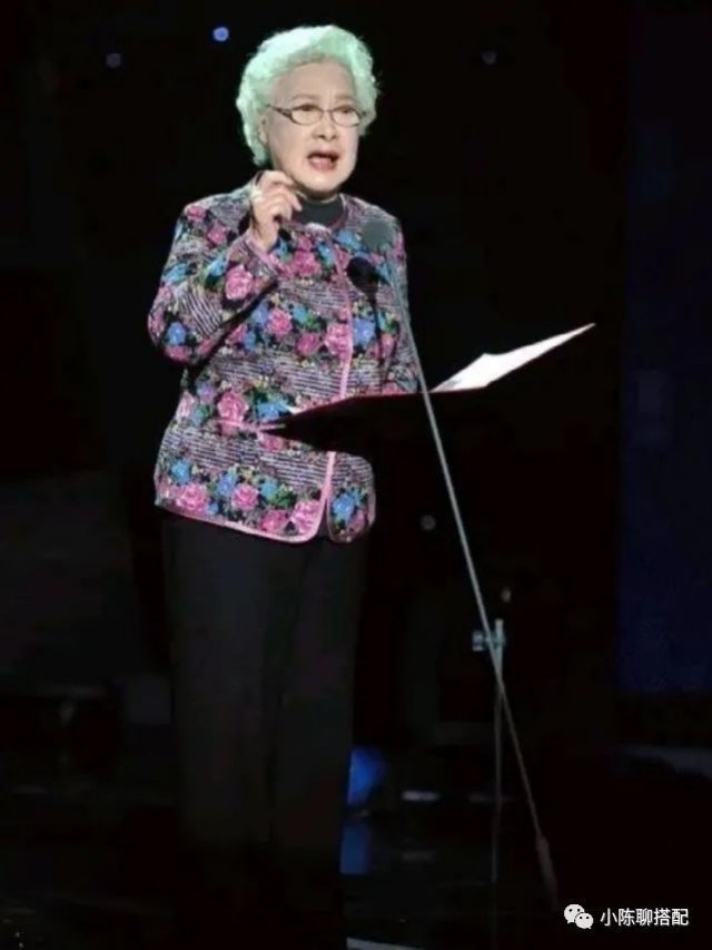 不过要注意的是,设计繁杂的服装要搭配简约的款式,既不会喧宾夺主,又能在视觉上显得更为和谐、美好。比如秦怡奶奶的这一身,碎花上衣与黑色内搭、裤子搭配,整体穿着简约又有美感。