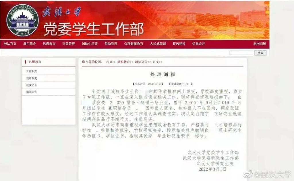 武汉大学通报称,白某某存在品行不端行为