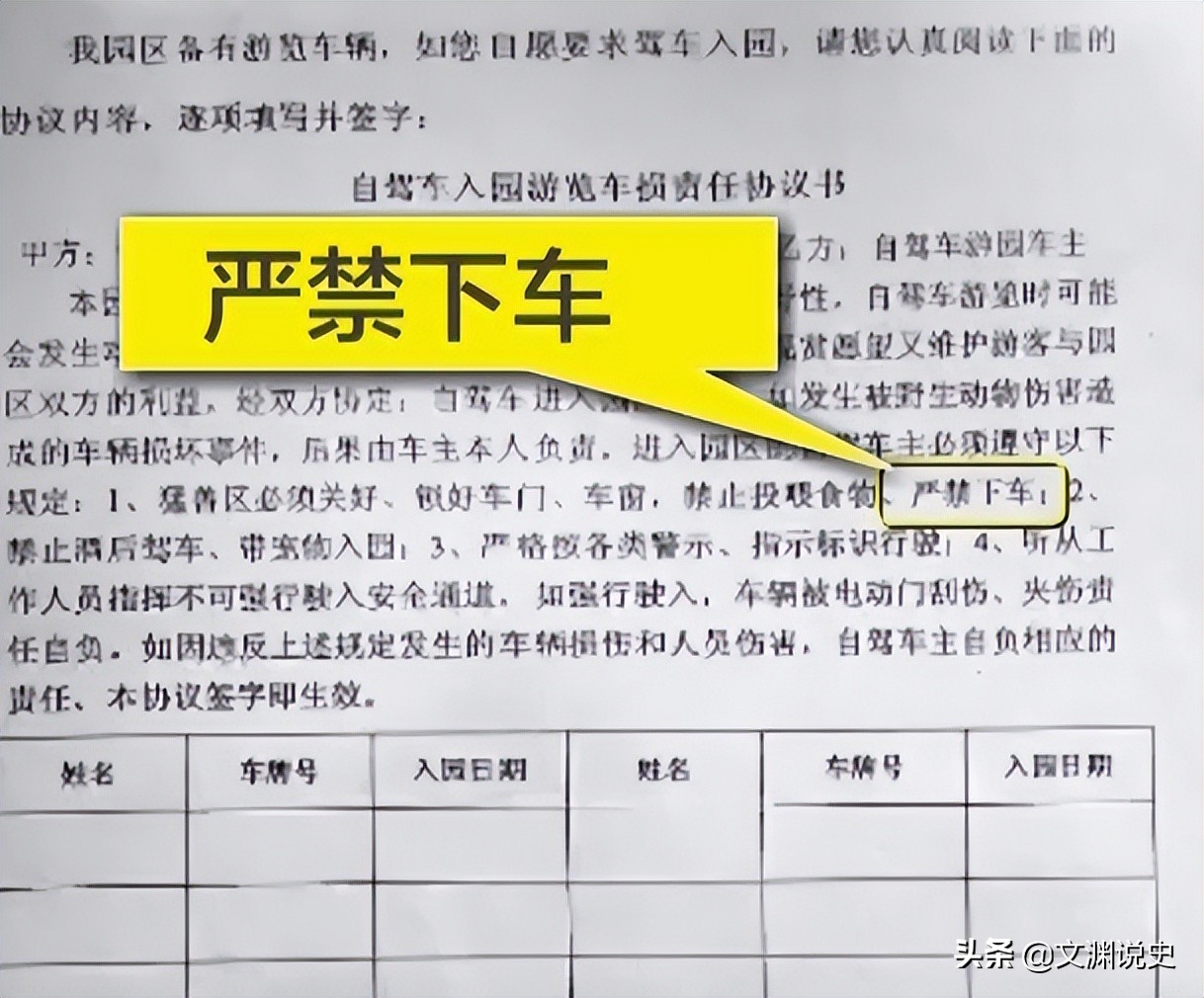 这份协议书上面明确写着:“进入猛兽区必须锁好车门窗、禁止向动物投喂任何食物”,其中还包含了最重要的一条“禁止下车”。
