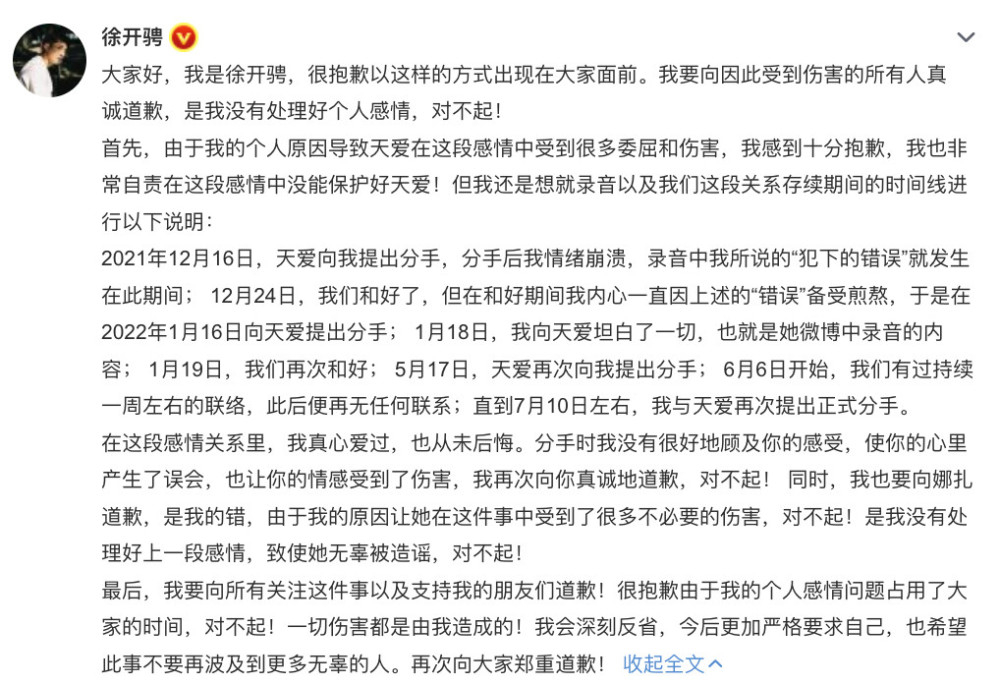 大家好,我是徐開騁,很抱歉以這樣的方式出現在大家面前。我要向因此受到傷害的所有人真誠道歉,是我沒有處理好個人感情,對不起! 首先,由於我的個人原因導致天愛在這段感情中受到很多委屈和傷害,我感到十分抱歉,我也非常自責在這段感情中沒能保護好天愛!但我還是想就錄音以及我們這段關系存續期間的時間線進行以下說明: 2021年12月16日,天愛向我提出分手,分手後我情緒崩潰,錄音中我所說的“犯下的錯誤”就發生在此期間; 12月24日,我們和好了,但在和好期間我內心一直因上述的“錯誤”備受煎熬,於是在2022年1月16日向天愛提出分手; 1月18日,我向天愛坦白了一切,也就是她微博中錄音的內容; 1月19日,我們再次和好; 5月17日,天愛再次向我提出分手; 6月6日開始,我們有過持續一周左右的聯絡,此後便再無任何聯系;