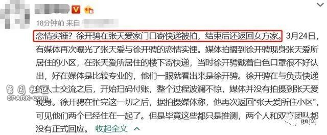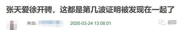 3月24號,有網友發帖詢問“張天愛徐開騁,這都是第幾波證明被發現在一起(电视剧)了”,帖中搬來媒體拍到的徐開騁在張天愛家門口寄快遞照片,大家紛紛評論,感覺翻來覆去爆了好多次,只有粉絲在裝瞎。