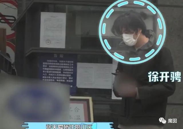 圖中,徐開騁戴著口罩,頭上扎個小辮,看上去很隨意,甚至有些不修邊幅。他穿著深色上衣外套和黑色褲子,在張天愛所住小區門口准備寄快遞。