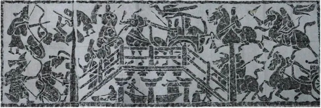 孝堂山画像石,左侧的匈奴战士被右侧的汉军碾压(胡汉战争拓片)