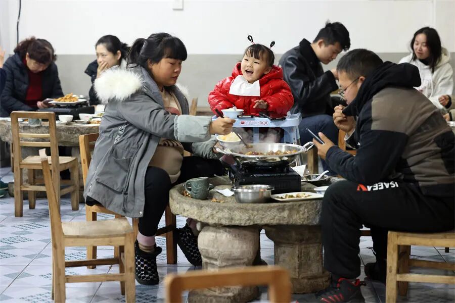 ▲一家子围着一个锅吃一个菜, 热气腾腾的