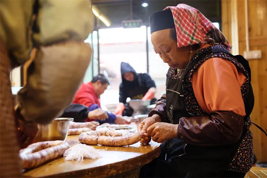 一听名字,本以为是那种景区常见的网红餐厅,不抱多大希望。点了几个菜,有鸡渎豆腐、旧州辣子鸡、糟辣肉片,在别处也吃过几回了,这里再吃,风味又不同。旧州的辣子鸡是一绝,他们又叫鸡辣子,突出的是辣子,鸡肉反倒可当配角。传统的做法非常独特,材料用的是旧州本地土鸡和本地辣椒,把辣椒做成糍粑辣椒,和鸡肉一起热油炒制好后,要装进坛子里封存,过几天再捞出来,冬天吃稍微加热一下,夏天则直接装盘,香味极其浓郁,鸡肉软糯,回味悠长。吃完,罗师傅带我们去了后厨,一看,掌勺的都是阿姨,是从附近村寨里请过来的。