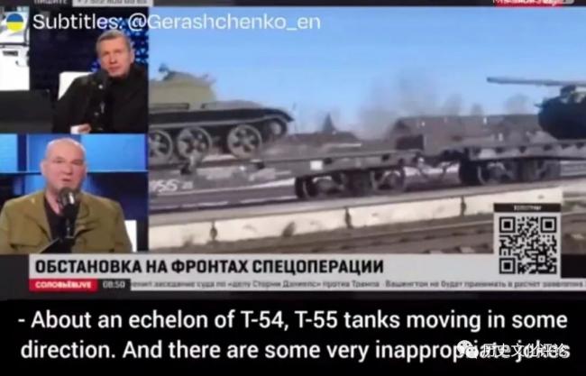 当他说这番话时,身后的大屏幕上放的是满载T-54/55坦克的军列向前线运输的画面。
