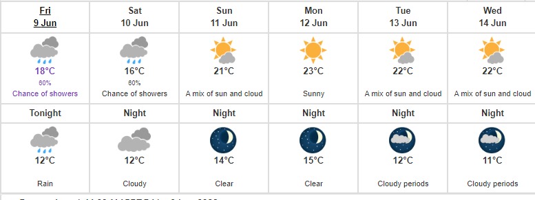 从今天6月9日星期五开始,预测大温天气波动,包括下雨和有可能出现阵雨,直到星期六,白天气温温和,徘徊在15摄氏度到17摄氏度之间,夜间最低气温为12摄氏度。