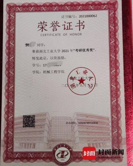 贺某考研获得的奖状(家属提供)