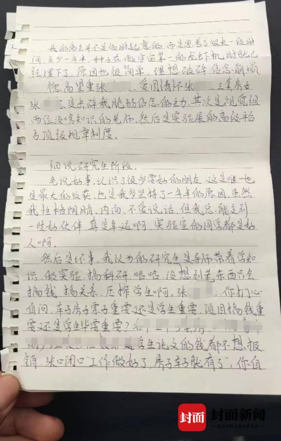 此前,贺某请假回家后烧炭轻生,并留下一封手写遗书,指责导师张某“压榨学生”“只会搞钱”“是击碎了我脆弱信念的主力”。
