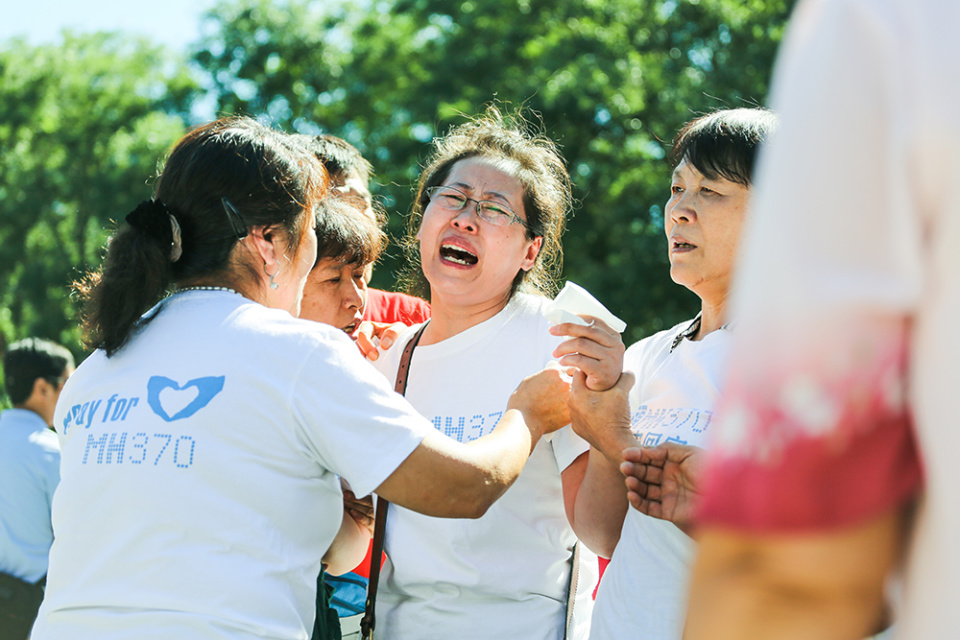 2014年9月8日,北京,雍和宫,马航失联家属为亲人祈福,由于失联时间已经半年,家属情绪崩溃。张丽霞(中)在北京找寻女儿的时候,情绪很容易激动,作为单亲妈妈,女儿是她一生的支柱。激动时候,需要好几个人来安慰她,才能平静下来,离开北京后不久,她就去世了。