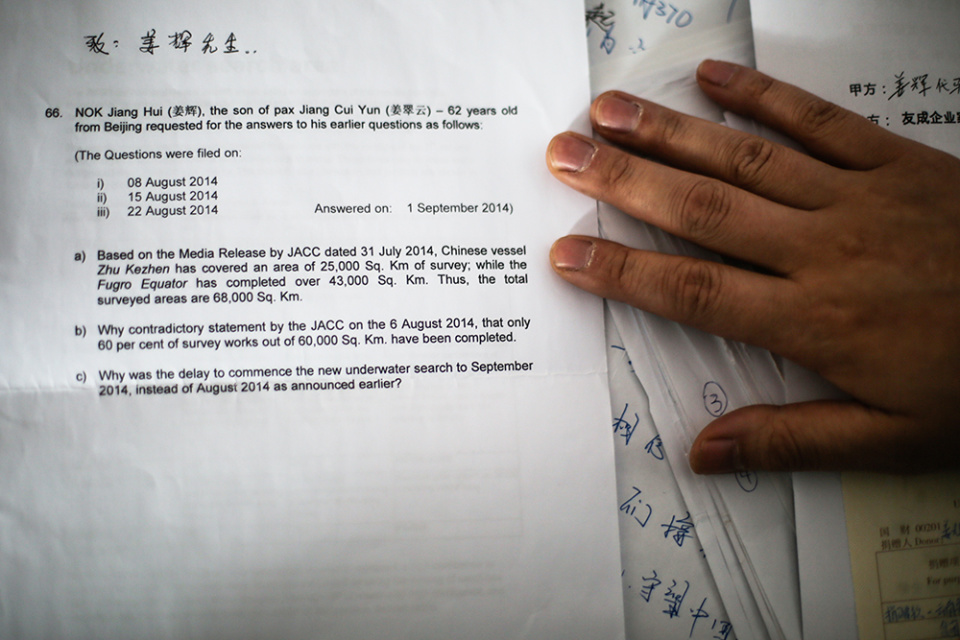 2014年12月21日,北京,姜辉向马来西亚航空公司提出疑问后,对方给予他的答复。