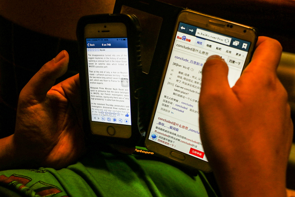 2015年9月4日,北京。凌晨1时许,马航失联乘客家属姜辉用两个手机查看新闻。当日,法国检察官宣布在留尼汪岛发现的机副翼确认来自失踪的航班MH370。姜辉英文不好,部分单词必须考手机翻译来帮助理解。