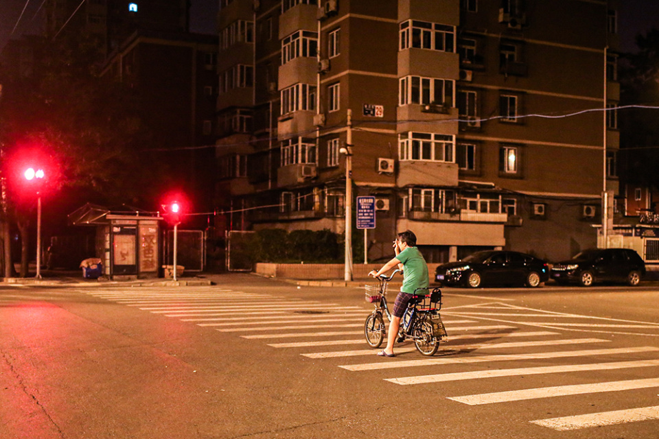 2015年9月4日,北京,凌晨1时许,马航失联乘客家属姜辉骑着电动车在路口等红灯。当日,法国检察官宣布在留尼汪岛发现的机副翼确认来自失踪的航班MH370。姜辉因担心另外一名家属徐京红喝醉出事,一直看到她熟睡,才从她家出来。