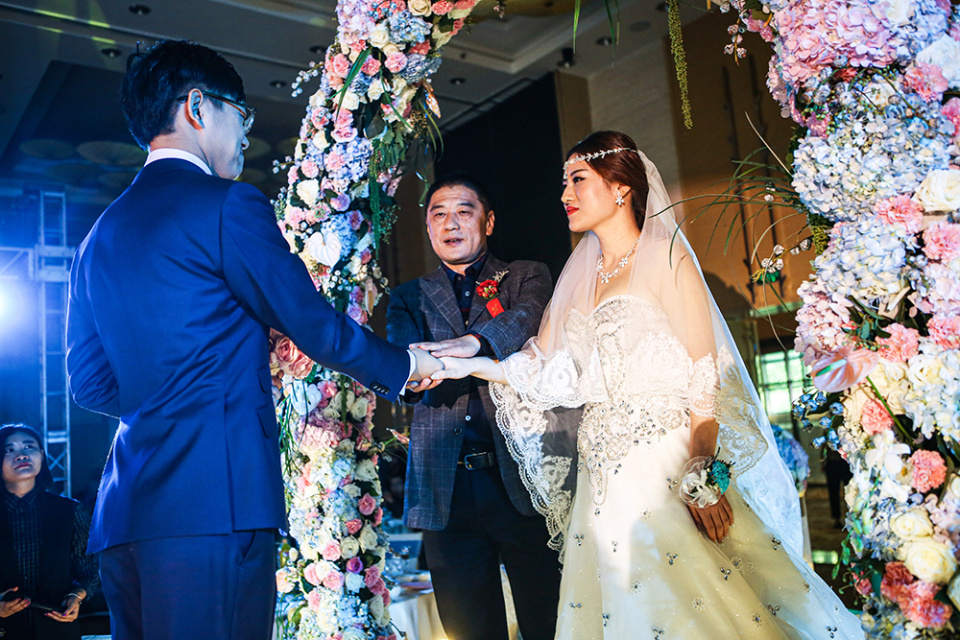 2015年10月18日,北京马航失联乘客家属杨露的结婚典礼现场。父亲把她的手交给她的爱人。杨露的妈妈在失联的MH370航班上。虽然缺少母亲的见证,她也开启了她的新生活。