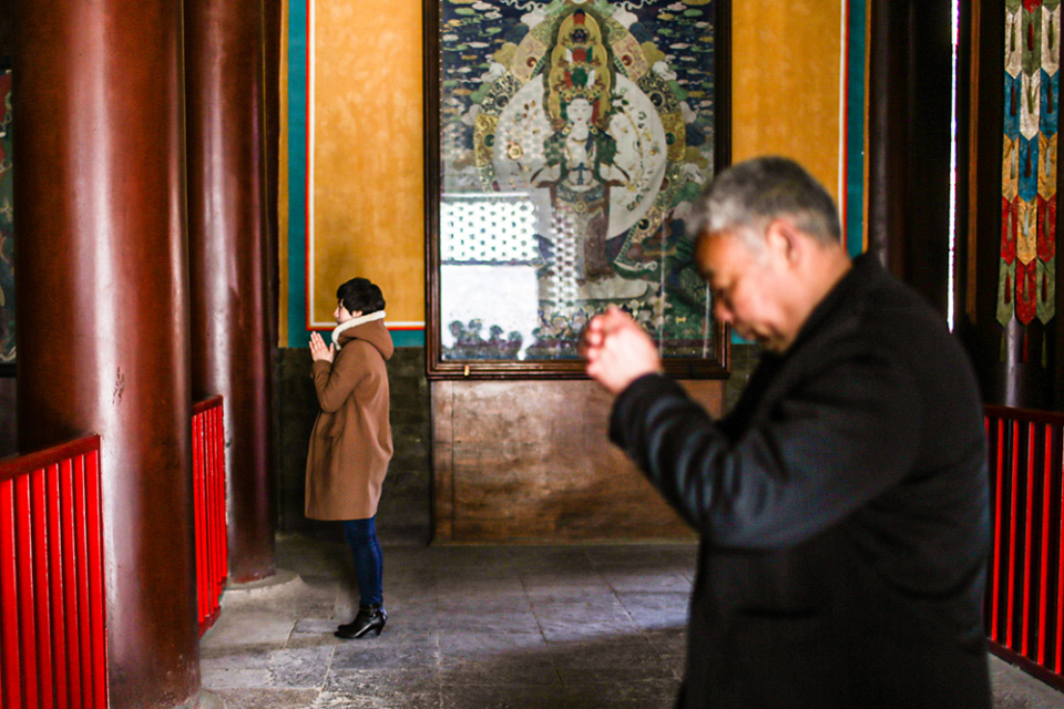 2016年3月8日,北京。当天为马航MH370失踪两周年,乘客家属前往雍和宫,为亲人烧香祈福。