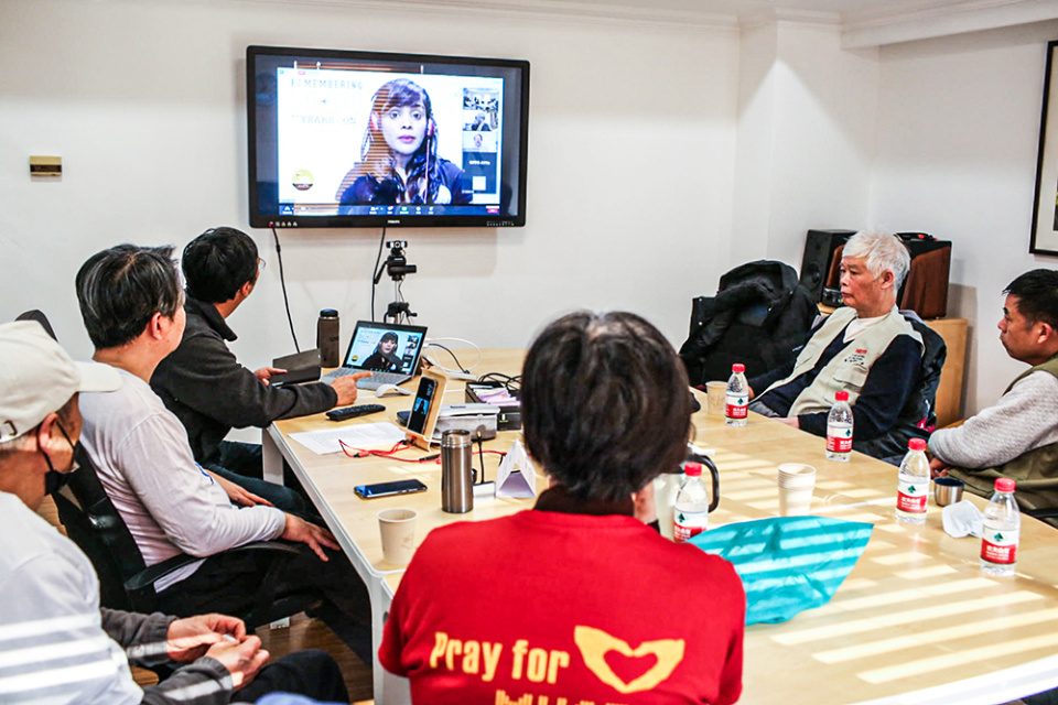 2021年3月8日,马航MH370失联7周年,北京的一家律所的会议室里,部分家属和马来西亚印度澳大利亚的家属在网上举行视频会,表达对亲人的想念,也希望用这种方式呼吁重启搜索。图中右二是家属胡家骥,现已去世。