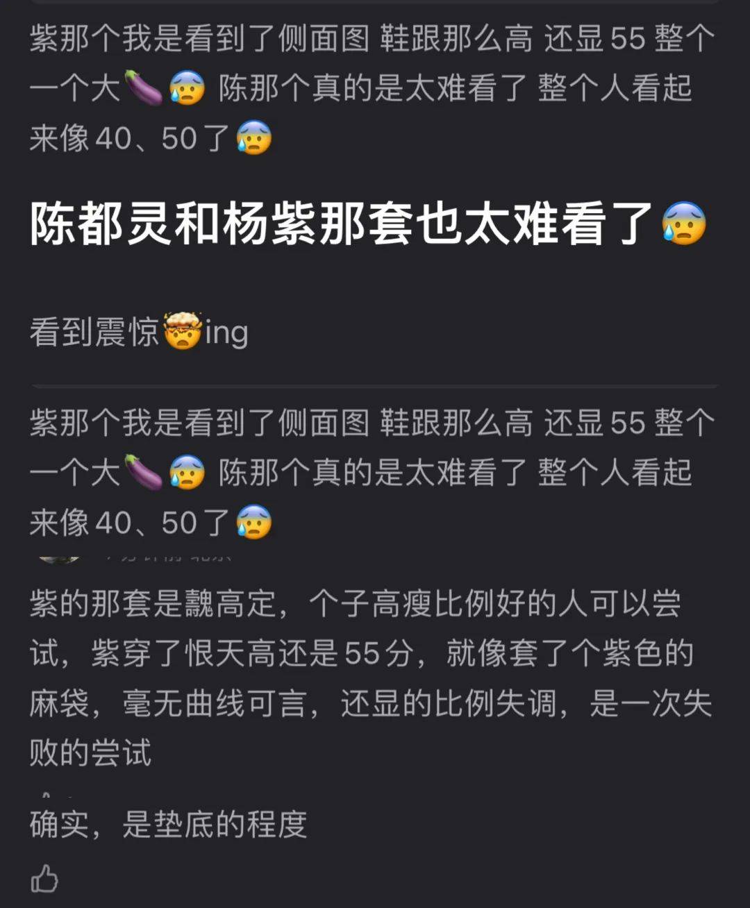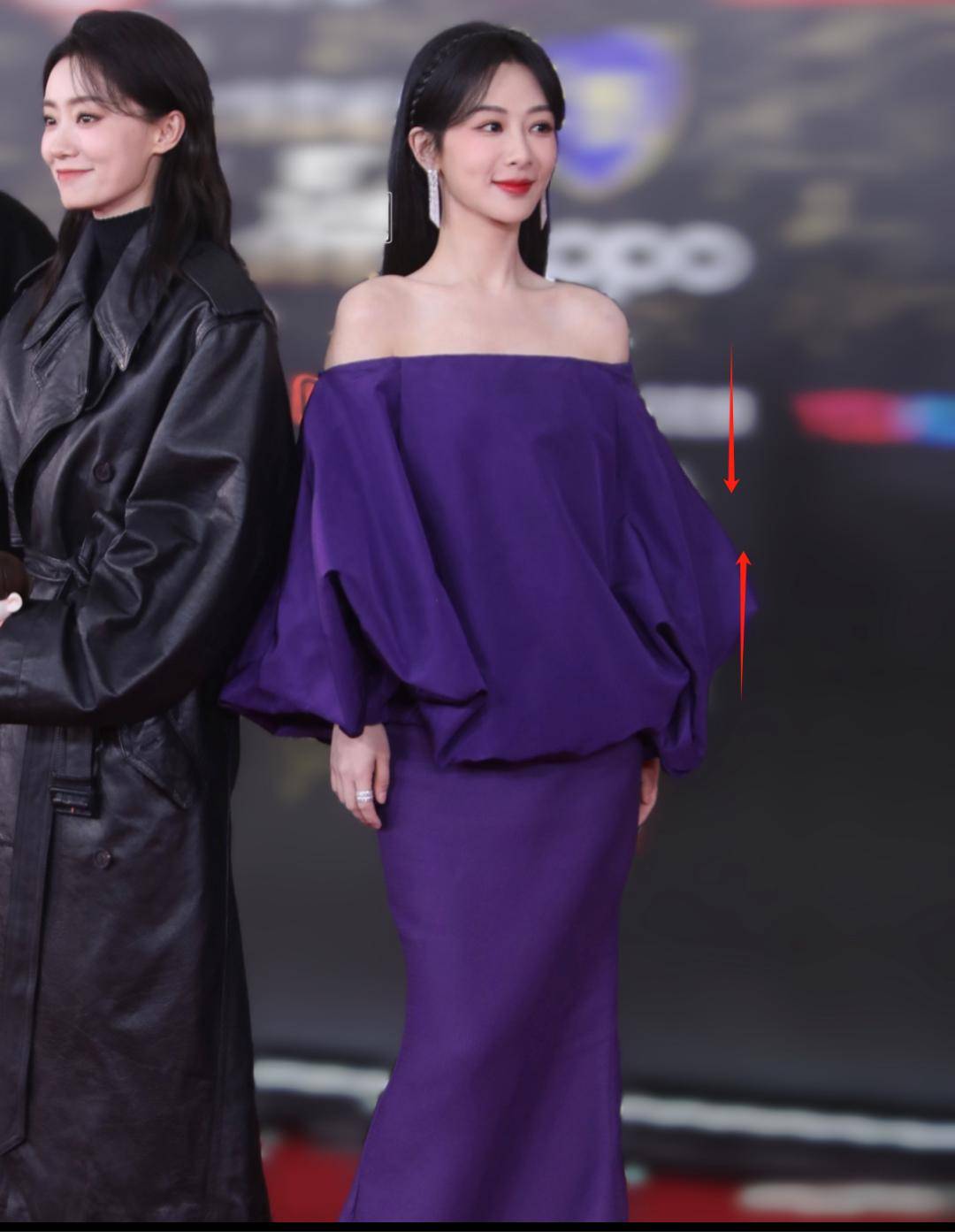 虽有高定在手,但杨紫的上身效果显然不如模特原版,因为这种裸肩加飞袖的组合非常考验穿衣者的身材比例,如果想要轻松驾驭,身材修长、手臂纤细等元素缺一不可。从现场效果来看,这款礼服让瘦身成功的杨紫秒变短手臂和55身,尽显身材劣势。
