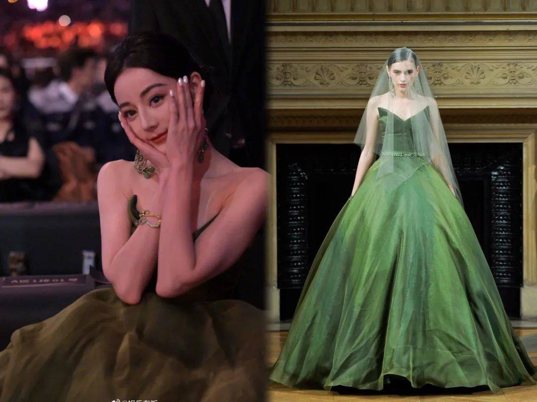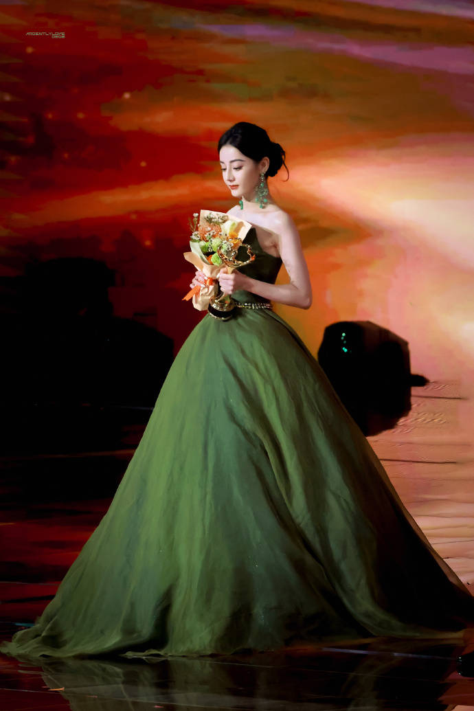 这次热巴不再继续“用力过猛”,选择了一款传统式的抹胸蓬蓬裙,墨绿色调更显气场。