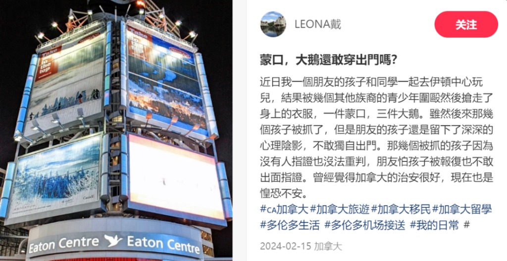 (加西网综合)很多在加拿大生活多年的人都感觉治安的问题似乎越来越多,就在前不久多伦多市中心购物中心几个华人孩子被一群青少年抢走大鹅和蒙口外套之后,最近加拿大一家著名购物中心再次发生刺伤事件。