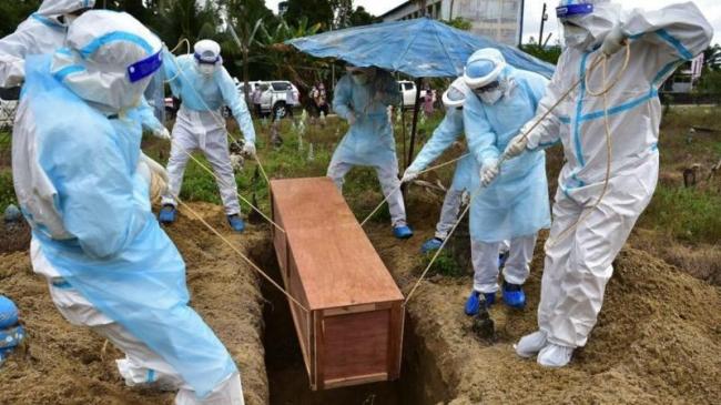 世界衛生組織稱,新冠疫情導致全球有近700萬人死亡。穿著個人防護裝備的工作人員在泰國那拉提瓦府的一個墓地埋葬一名死於新冠的民防志願者(2022年2月24日)圖像來源,GETTY IMAGES