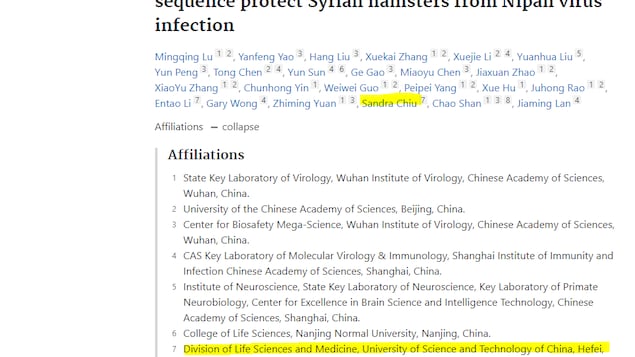 合肥中國科學技術大學的科學家Sandra Chiu,最近發表了關於猴痘、尼帕病毒(Nipah)和埃博拉病毒的研究。該大學與中國人民解放軍關系密切,而Sandra Chiu使用的電子郵件地址,包括邱的本來姓氏qiu和名字首字母x。