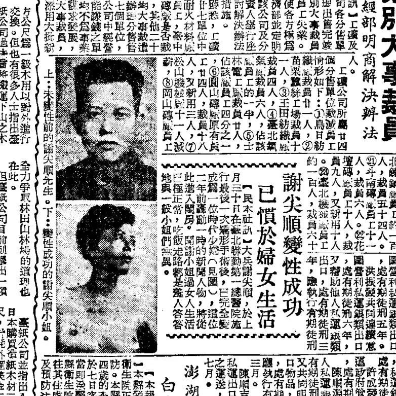谢尖顺是台湾史上第一位接受性别重置手术的人。谢尖顺是间性人,以男性身份生活到三十五岁,其本人曾表示不愿意接受性别重置手术切除男性性器官,1953年其因阑尾炎到医院就诊,医师认为从生理情况切除其正在恶化的男性性器官比依照其本人意愿更重要,报道写“牺牲个人幸福给医学做贡献”。这一手术事件当时在台湾社会引起空前反响,社会各界将其视为“台湾医学的伟大成就”,强调的是“台湾医学或赶上美国”。[6][7]